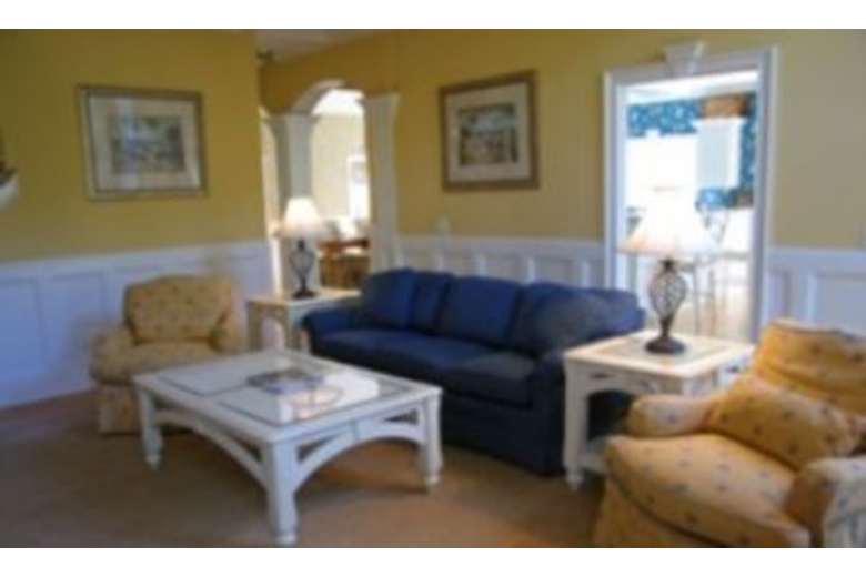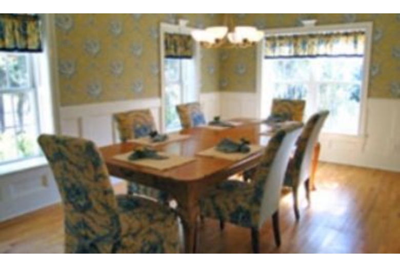 The living room, with gas log fireplace, coffered ceiling and direct deck access, overlooks the tidal marsh. The home's many amenities include a fabulous eat-in kitchen, formal dining room,and internet access , you will also enjoy the look of custom crown molding and hardwood floors. Each bedroom has its own bath and walk-in closet. The loft includes a den perfect for enjoying television or board games and has a pull-out sofa! Elegantly appointed Master bedroom (K) with private bath including whirlpool tub. Guests enjoy the 3 TVs and laundry room.Surrounding Description