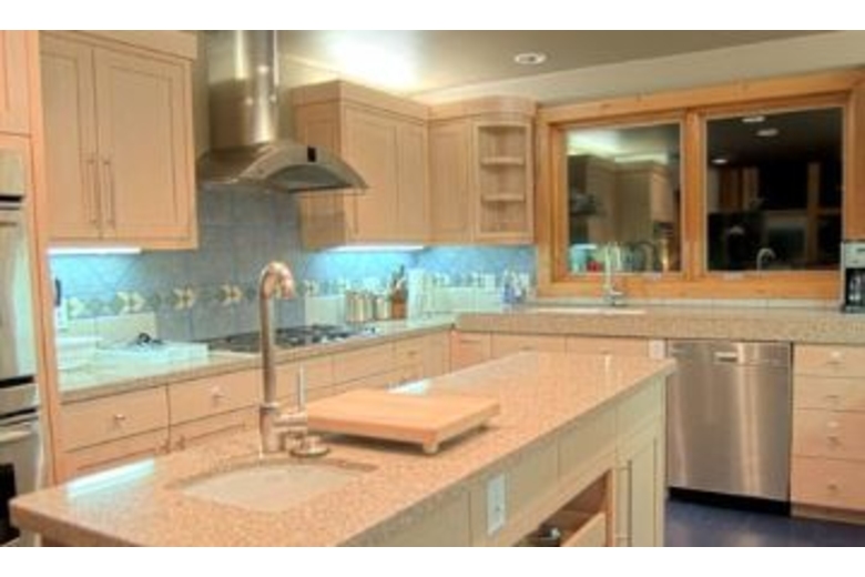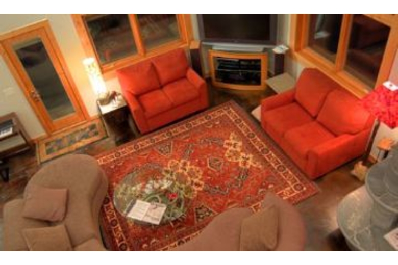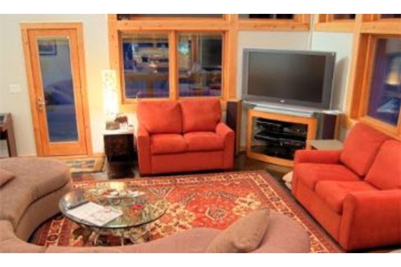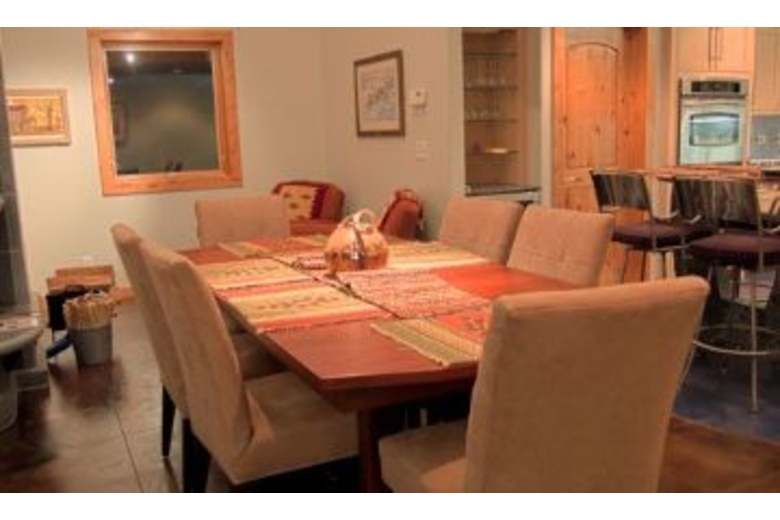 The entrance level has beautiful stone floors with wood and upholstered benches and there is a stairway to the house's upper levels. There is a utility room with boot dryer, storage space for athletic gear, and the garage entrance.The stairs from foyer lead to spacious open floor plan housing Kitchen, Living room, Dining room and sitting area. 2-story vaulted ceilings.The kitchen is adjacent to the dining and living room. This fully equipped kitchen has new, stainless steel high-end, energy efficient appliances, beautiful wood cabinets and granite countertops. It contains a wine refrigerator, D/W, telephone, microwave, range, refrigerator. Breakfast island of granite and wood with four stools. There are copper accents, marble countertops, and tile flooring.The open dining room seats 6.The open living room has a curved sofa and two love seats that provide sufficient seating. There is a big screen TV, DVD player, CD stereo. There is an efficient soapstone fireplace. There are beautiful stone floors. The living room also provides access to large back deck with gas grill, hot tub, and mountain views.The sitting area off of living and dining areas has 2 reading chairs with an ottoman and is a great place for reading or games.The is a half bath at the top of the stairs.There is an office with a large built in desk and storage located off of living room. This office opens to the master bedroom.The master bedroom has a king platform bed, large walk-in closet and beautiful wood furnishings. French doors access large back deck. The master bath is an attached full bath with Jacuzzi tub and separate glass-blocked shower.The laundry is located next to half bath, contains front-loading energy efficient clothes washer and dryer.There is a third level with another sitting area and two additional bedrooms. The sitting area at the top of stairs opens to loft area overlooks the living and dining areas. Access to wrap around deck. Large closet for additional storage.There is also a full bath off of the hallway, with beautiful fully tiled large shower and granite countertopsThe second bedroom has a king sleigh bed with valley view, dark wood furnishings, attached half bath, and walk in closet.The third bedroom has a queen bed , closet, light wood furnishings, and valley view.Surrounding Description