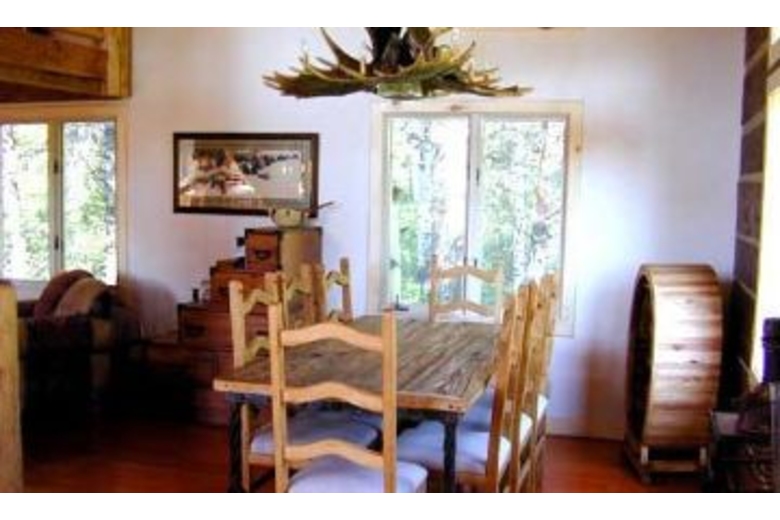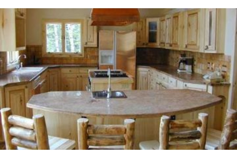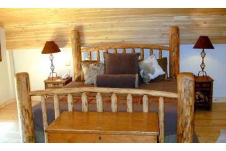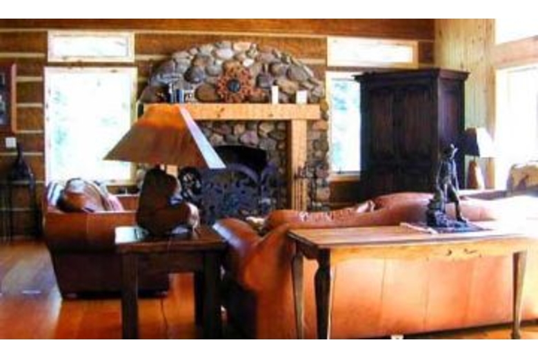 The entrance to this home is on the lower level. There are three bedrooms on this level, including a master suite with a queen sized bed and fireplace. The second bedroom has a queen sized bed and the third bedroom has two twin beds. Western, lodgepole accents are found throughout the bedrooms. There are TV's in most of the bedrooms and each room offers comfortable bedding as well as tasteful western decor. Stairs lead to the main level offering an open floor plan. This spacious area connects the living room, reading area and kitchen. There is a nice reading area with overstuffed chairs in addition to the living room with a stone fireplace, comfortable couches, TV, VCR, DVD and stereo. The spectacular front lodgepole deck is accessible from this level. The kitchen has brand new, copper appliances, island with gas stove & oven and breakfast nook with 4 stools. This second level has a second master bedroom with king sized bed, TV, and a separate full size bathroom with a jacuzzi tub.Surrounding Description