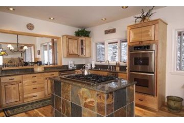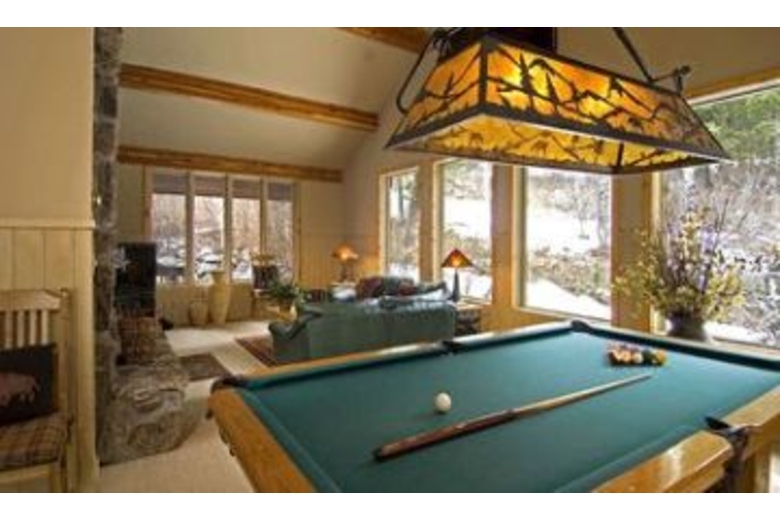 The living room offers a large double sided stone fireplace which is the focal point of the large great room. Living room has numerous picture windows allowing natural light and is enclosed with vaulted ceilings. This room also offers a dining table for 12, a pool table and access to the large outdoor deck. The kitchen is state of the art and overlooks the great room with another seating area for smaller group gatherings and a separate private deck. The main level offers the master bedroom with a king bed and is complete with its own television, fireplace, and also offers his and her bathrooms with a steam shower, jetted tub, and walk in closet all complimented with access to the outdoor deck. The lower level offers four bedrooms, the first offers king bedding with its own fireplace and TV as well and is located next to a full bath. The other 3 offer a bedroom with 2 twins, walk in closet and full bath, another with 2 twins, and the last bedroom offers a twin with trundle and a bunk with a twin over a double, these share the fourth bath. A large laundry room, fooseball room, and two car garage.Surrounding Description