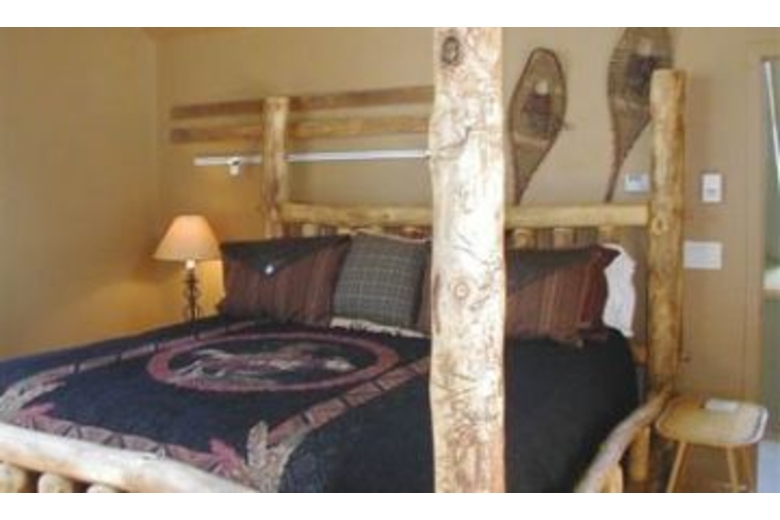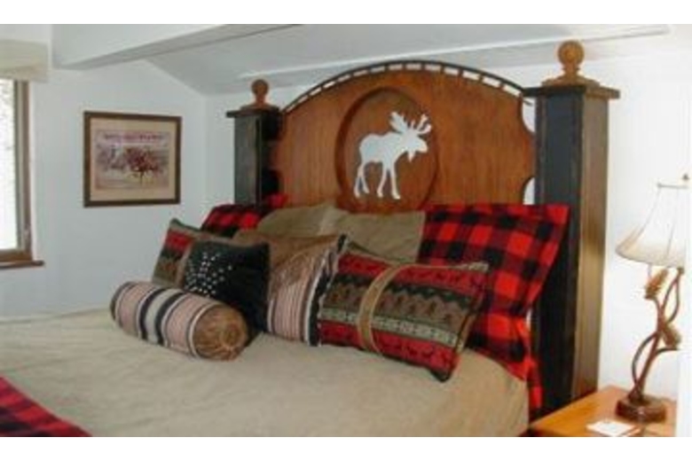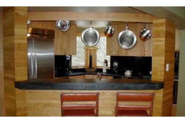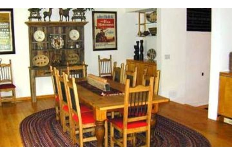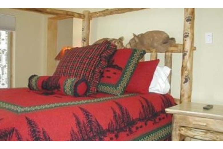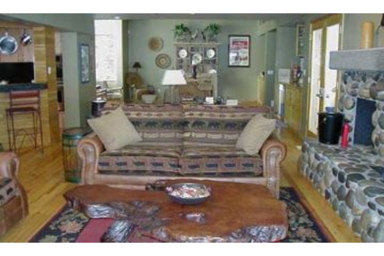 In the entry way, there is a large slate entry. There is also a wine cellar. The walls are all river rock. On the second level there is a grand living area with a large river rock fire place, leather sofa, 2 large leather chairs with ottomans, 2 wicker chairs, 2 person rocker, and a desk with chair. There are floor to ceiling windows with views of the adjacent ski runs. There is a wet bar between the living and dining area. It is equipped with a mini fridge and an ice maker. The adjacent dining room will seat 10 people. There is a game table with 2 lodgepole chairs off of the dining area. The kitchen is open to the living and dining areas. It has a granite island with sink and a 2 bar stools. There are also the following in the kitchen: side by side fridge with ice and water dispenser, two ovens, microwave, wine cooler, and dishwasher. This kitchen contains everything you might need to prepare an elaborate meal. Through a hall and solid double doors on the main floor is a king suite. This room has doors that lead to the deck as well as house the glass tower with spiral steps that lead to the bonus room with queen bed on the third floor. There is a decorative fire place (non-burning), 2 large leather chairs with ottomans, TV, Phone, 2 walk in closets, large master bathroom with river rock doorless shower, jacuzzi tub, and double sinks. The second king suite has a bathroom with a walk-in shower and the sink is in the bedroom, built into an antique chest. There are 2 wall closets in this room. The sitting room has a sofa, 4 chairs, stereo system, large screen TV, and built-in desk with data port and DSL. On the third floor, the king bedroom has a comfortable chair, sliding door to small private deck, rocker, phone, 2 closets, phone, and en-suite bath with separate walk in shower, large tub and double sinks. The queen bedroom opens to the bonus room with 1 queen bed. On the fourth floor there is a bedroom with 1 king bed and a set of bunk beds. There is a TV/VCR and a decorative fireplace. There are also sliding doors to a private deck. Adjacent there is a full Bathroom with double sinks and a walk-in shower with body sprayers. Spectacular deck with wood patio furniture facing Rendezvous mountain with views of the ski runs through the wooded lot. Wine cellar and outdoor hot tub.Surrounding Description